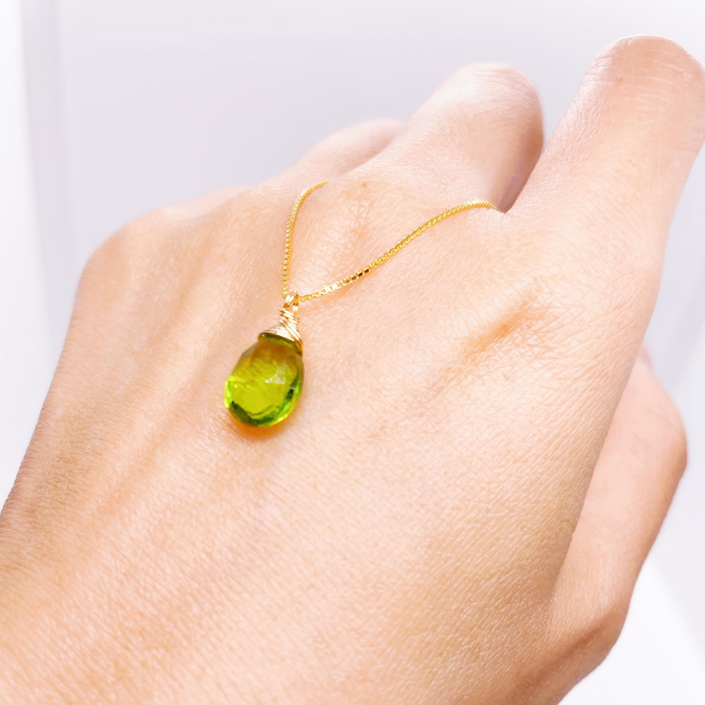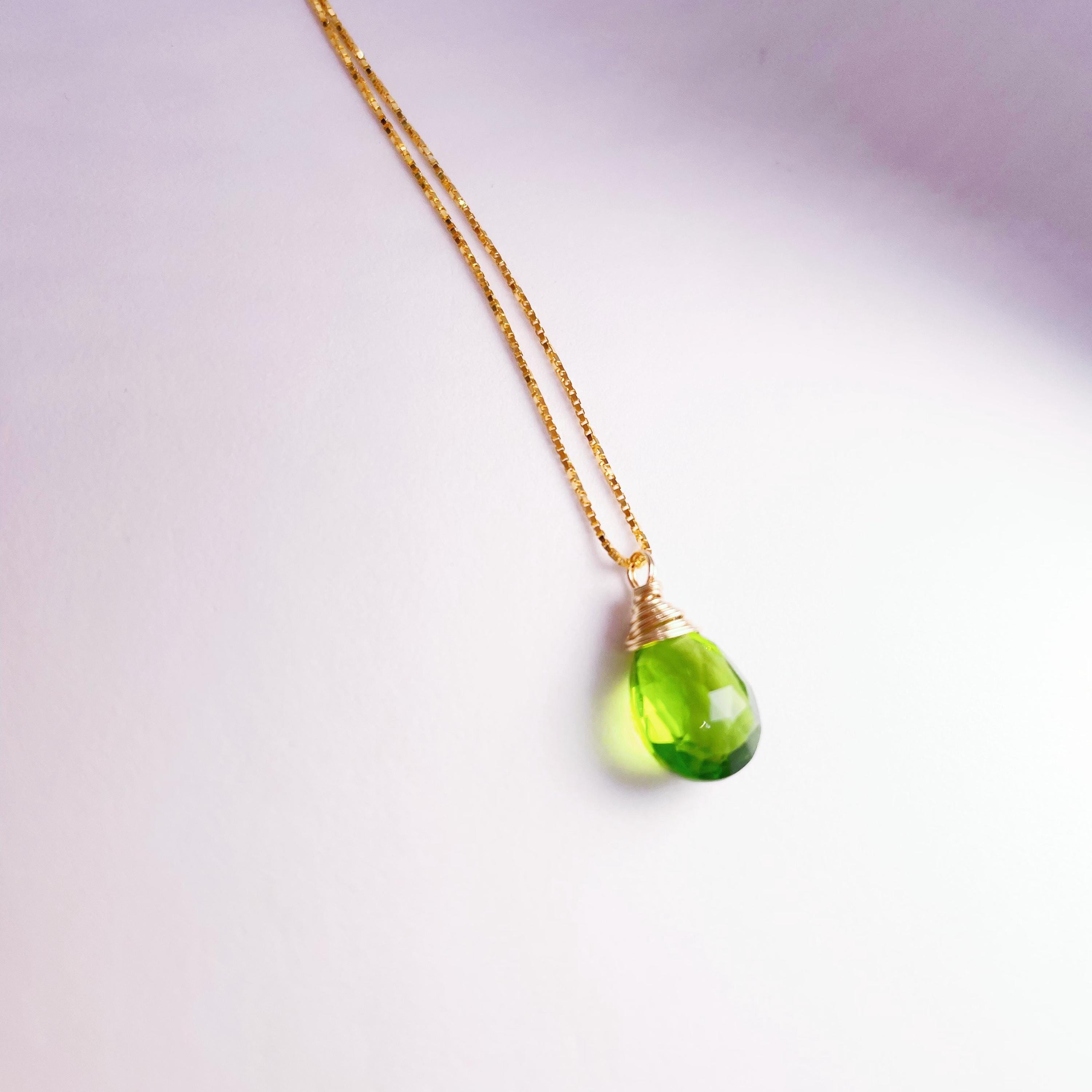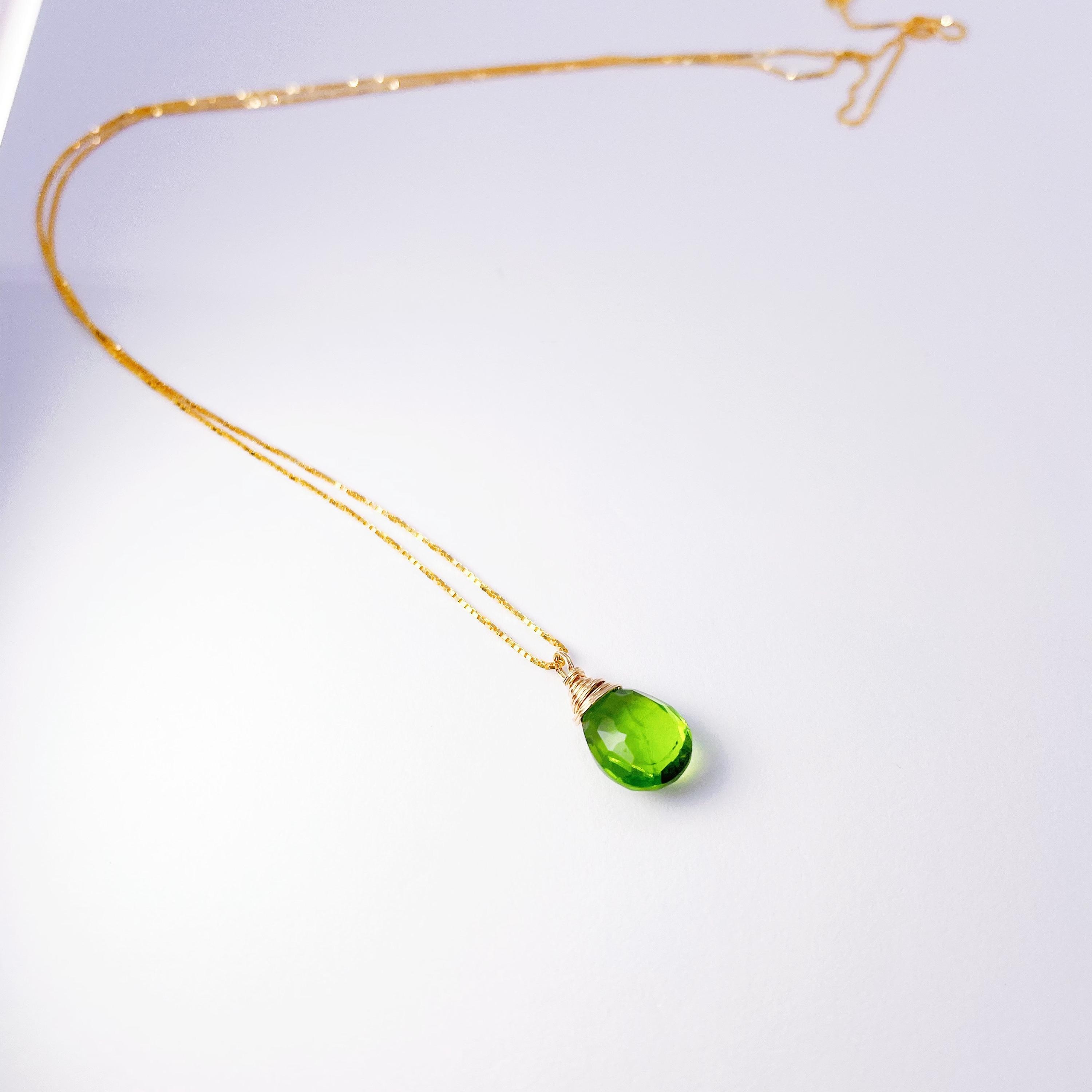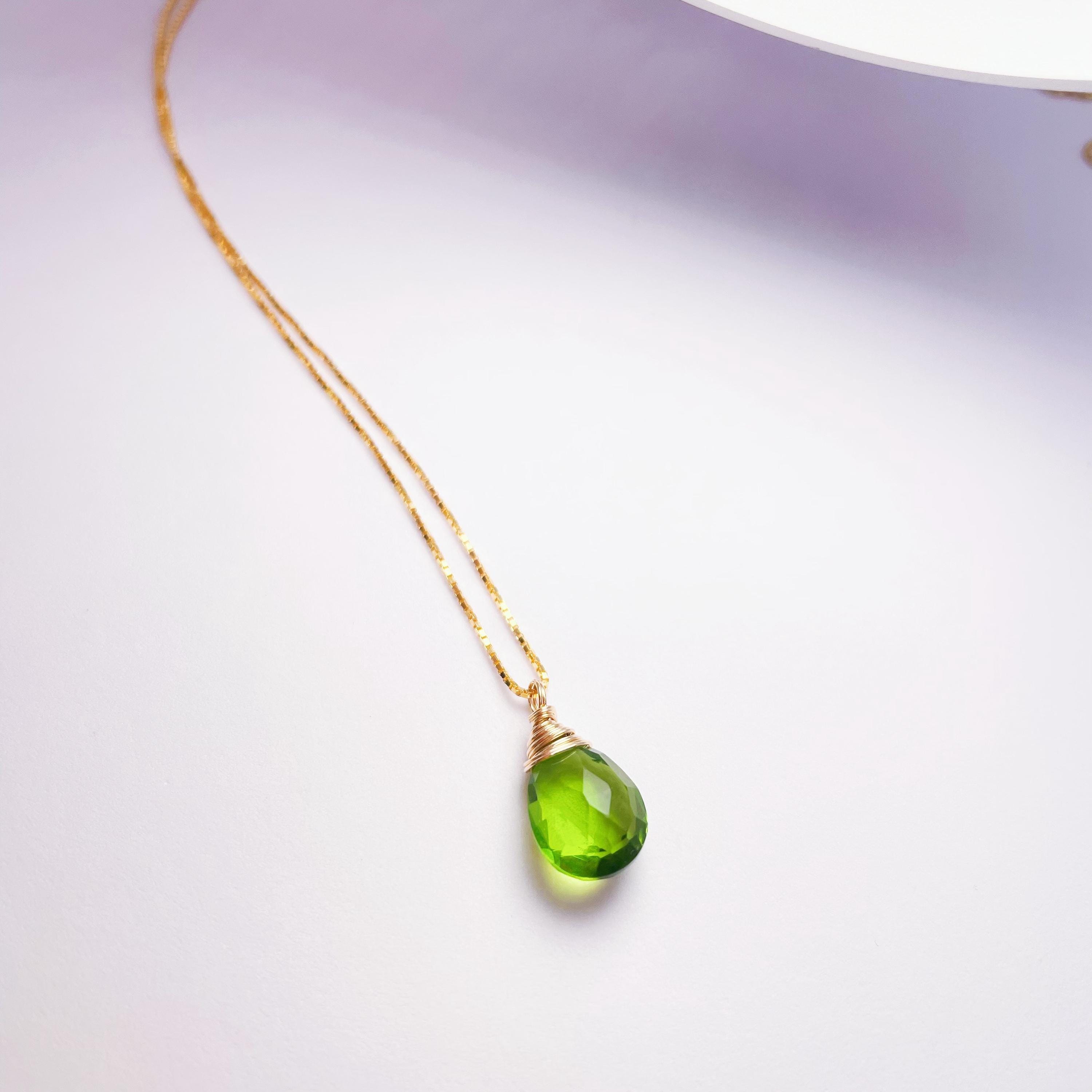 This Peridot Green pendant necklace features a luminous faceted Hydro Quartz drop. Its vivid green hue symbolizes renewal and joy, adding a fresh, elegant glow to any outfit.