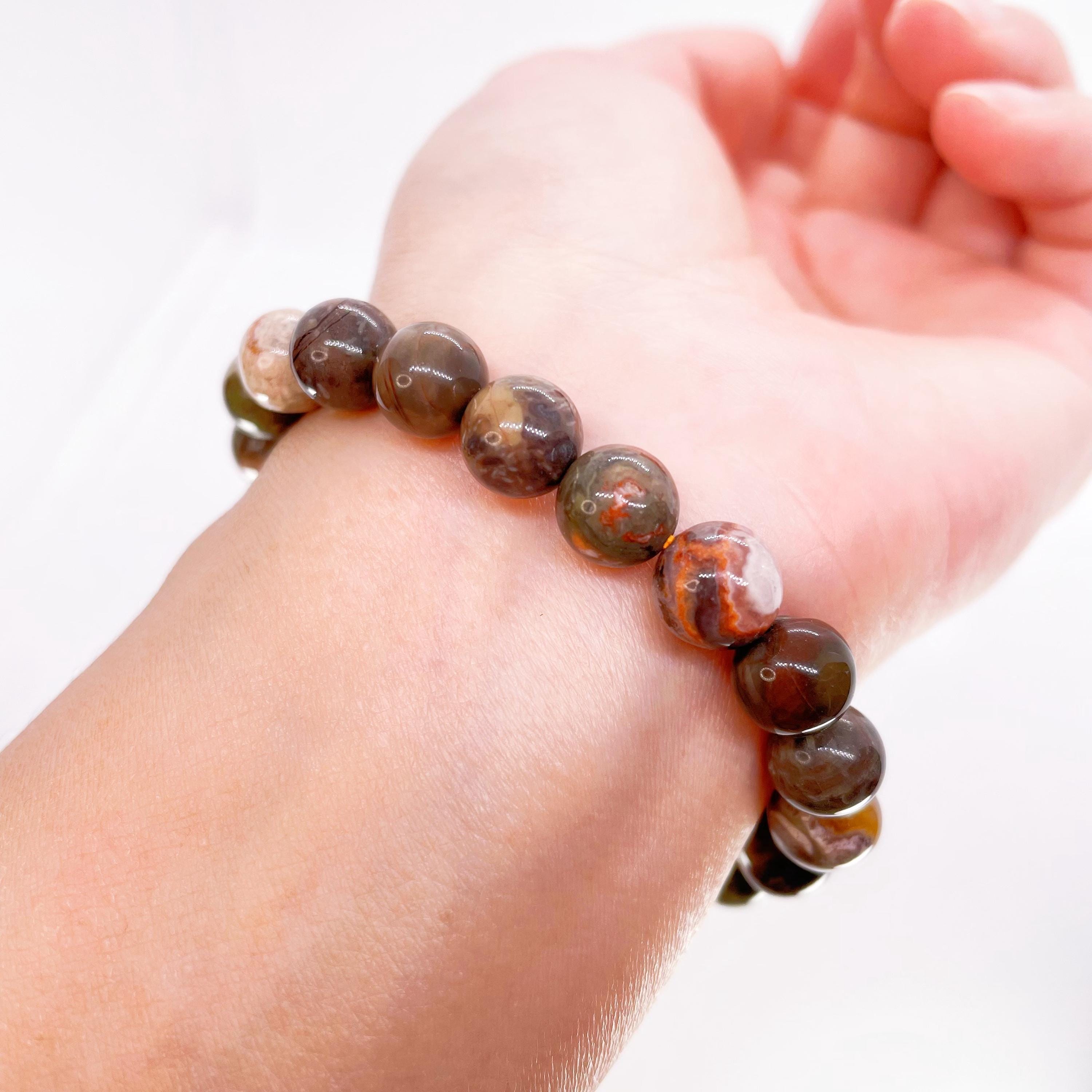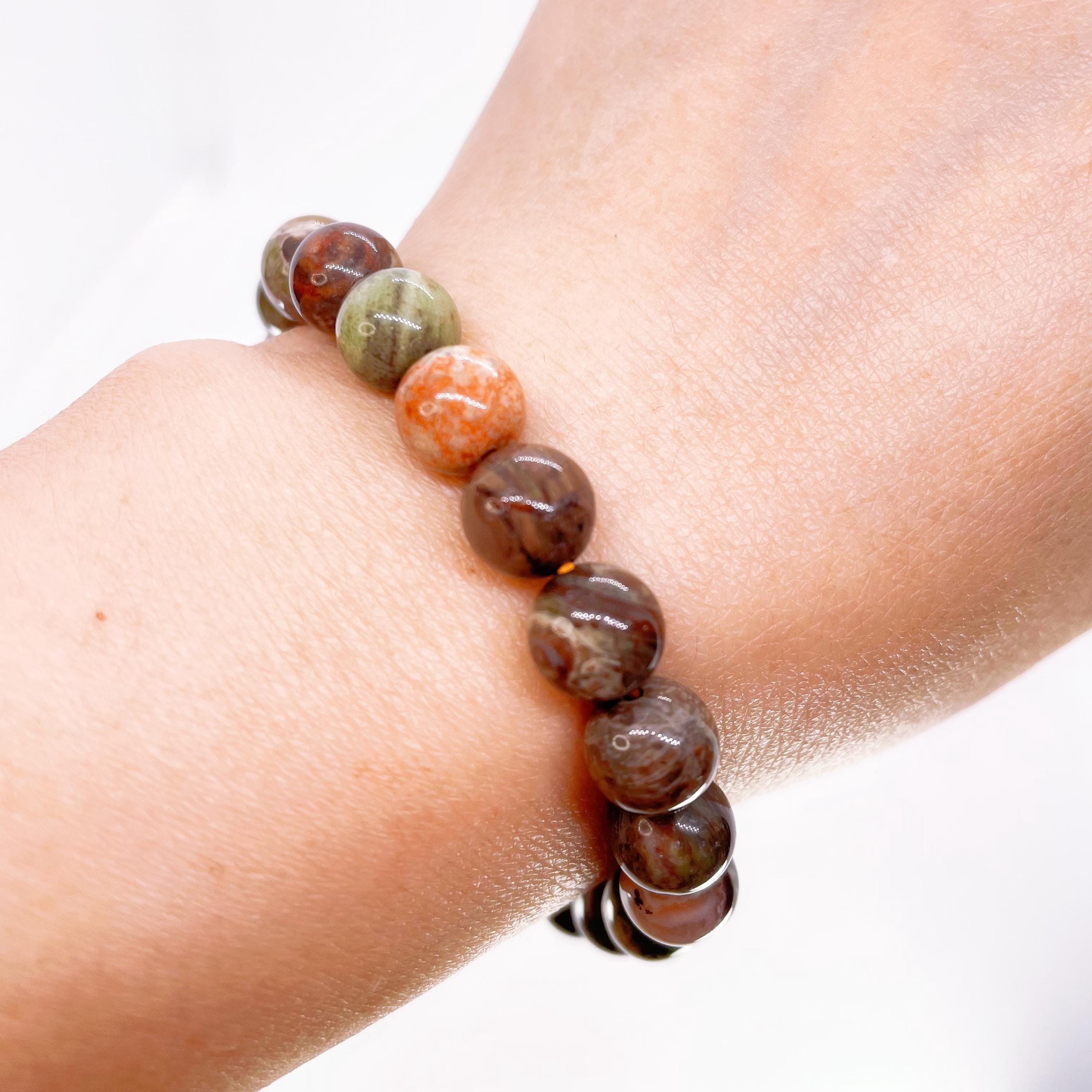 Grounded yet vibrant, this rainforest jasper bracelet features natural 8mm beads in earthy green tones, each bead unique in pattern and color.