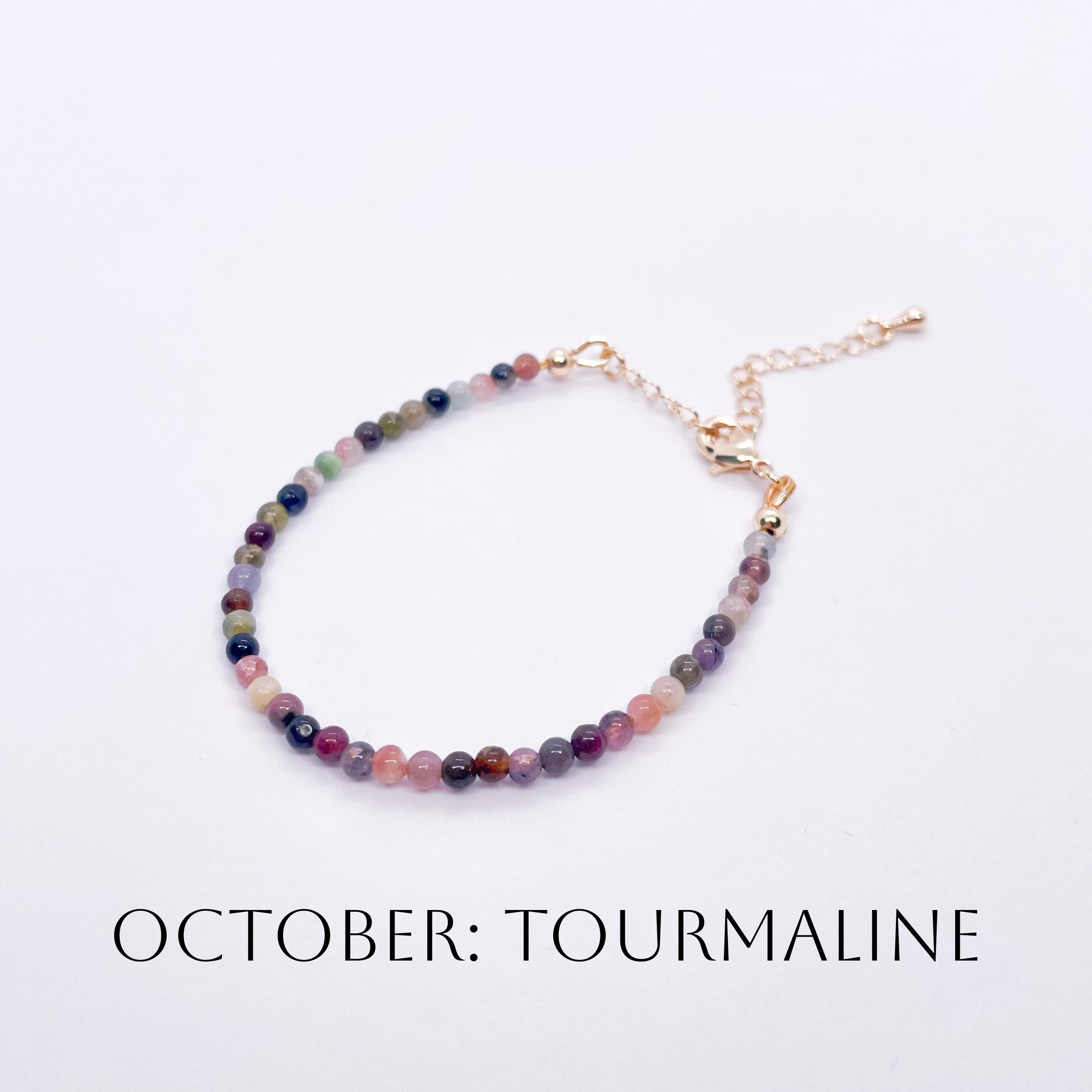 Delicate and full of light, this birthstone bracelet is crafted with dainty faceted gemstone beads that catch and reflect the light beautifully. Each stone is carefully chosen to represent its month, with smooth, round tourmaline beads for October.