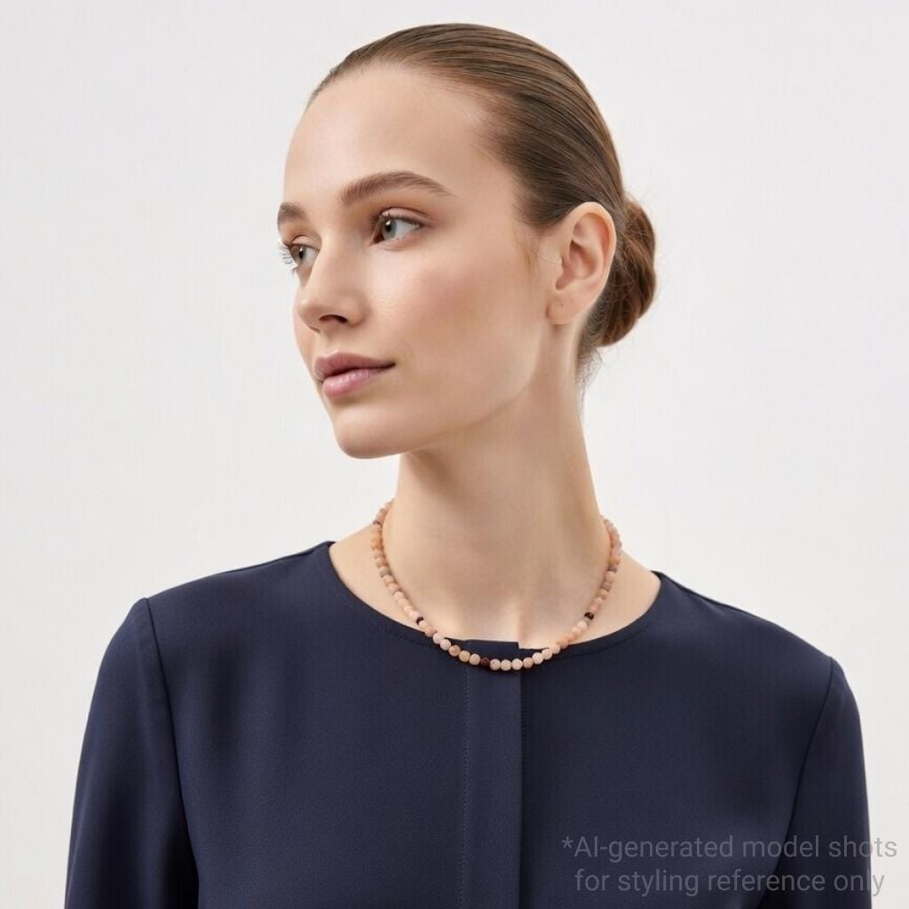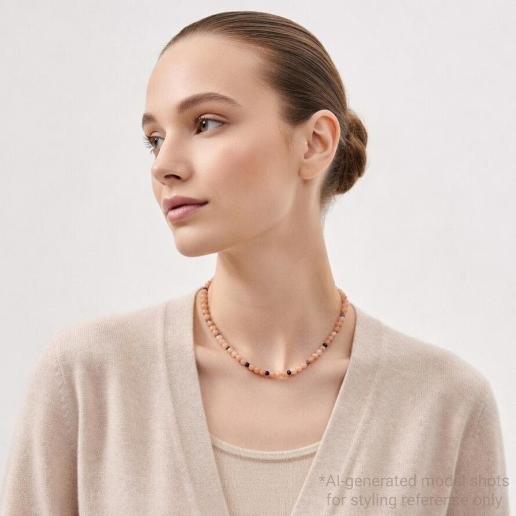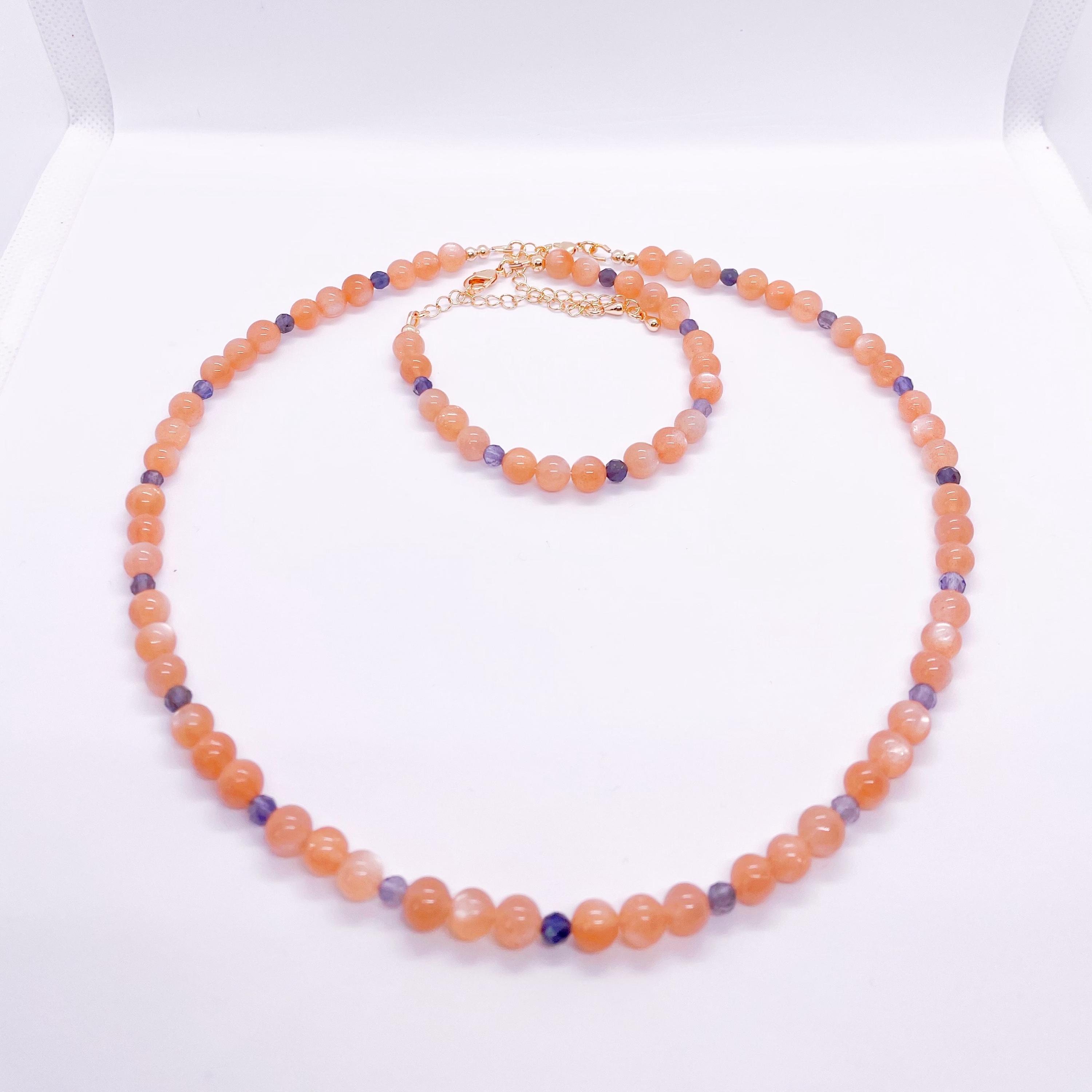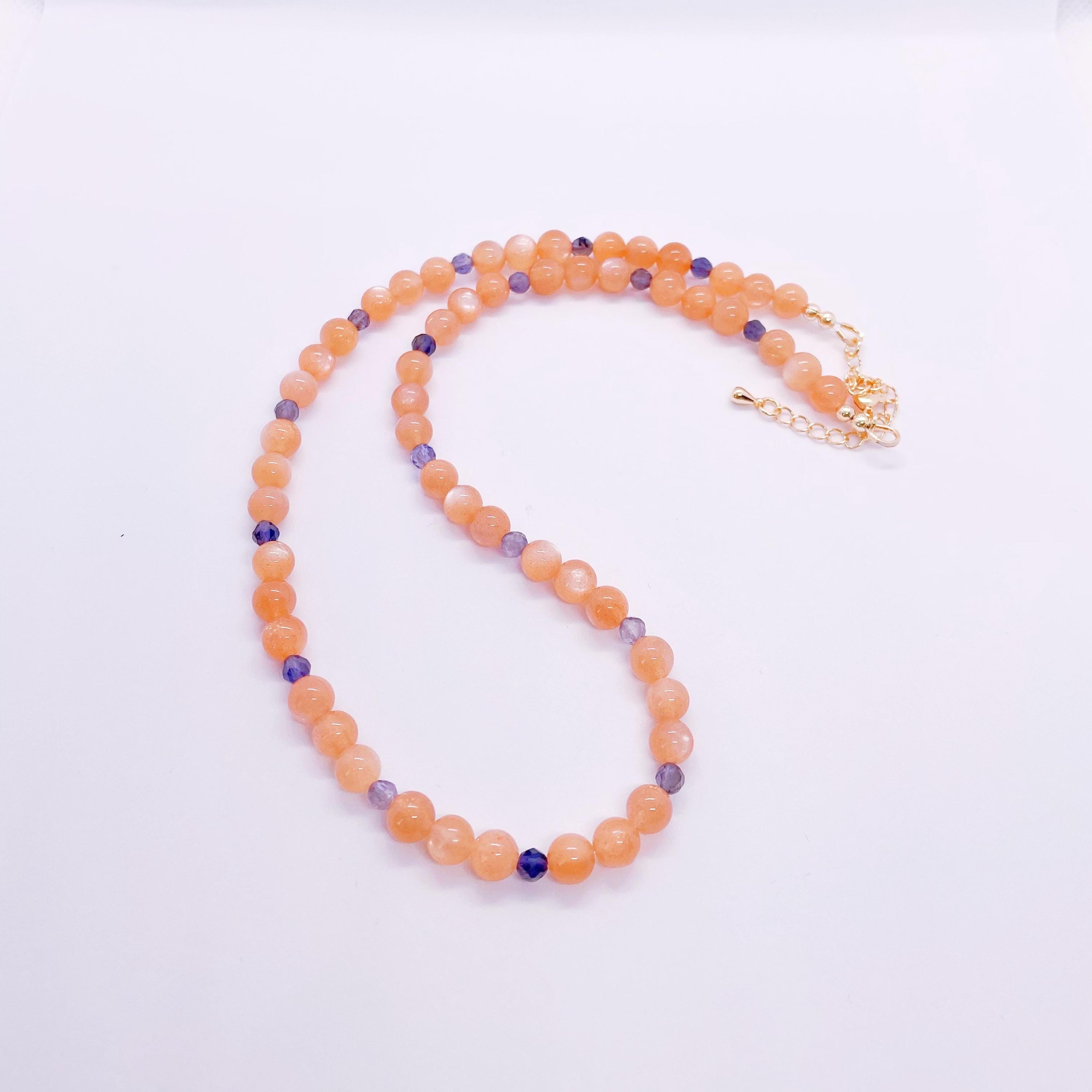 This Peach Moonstone & Iolite beaded necklace brings a soft, warm glow to your look without feeling loud or flashy. It can brighten up your everyday look or make a special occasion memorable.
