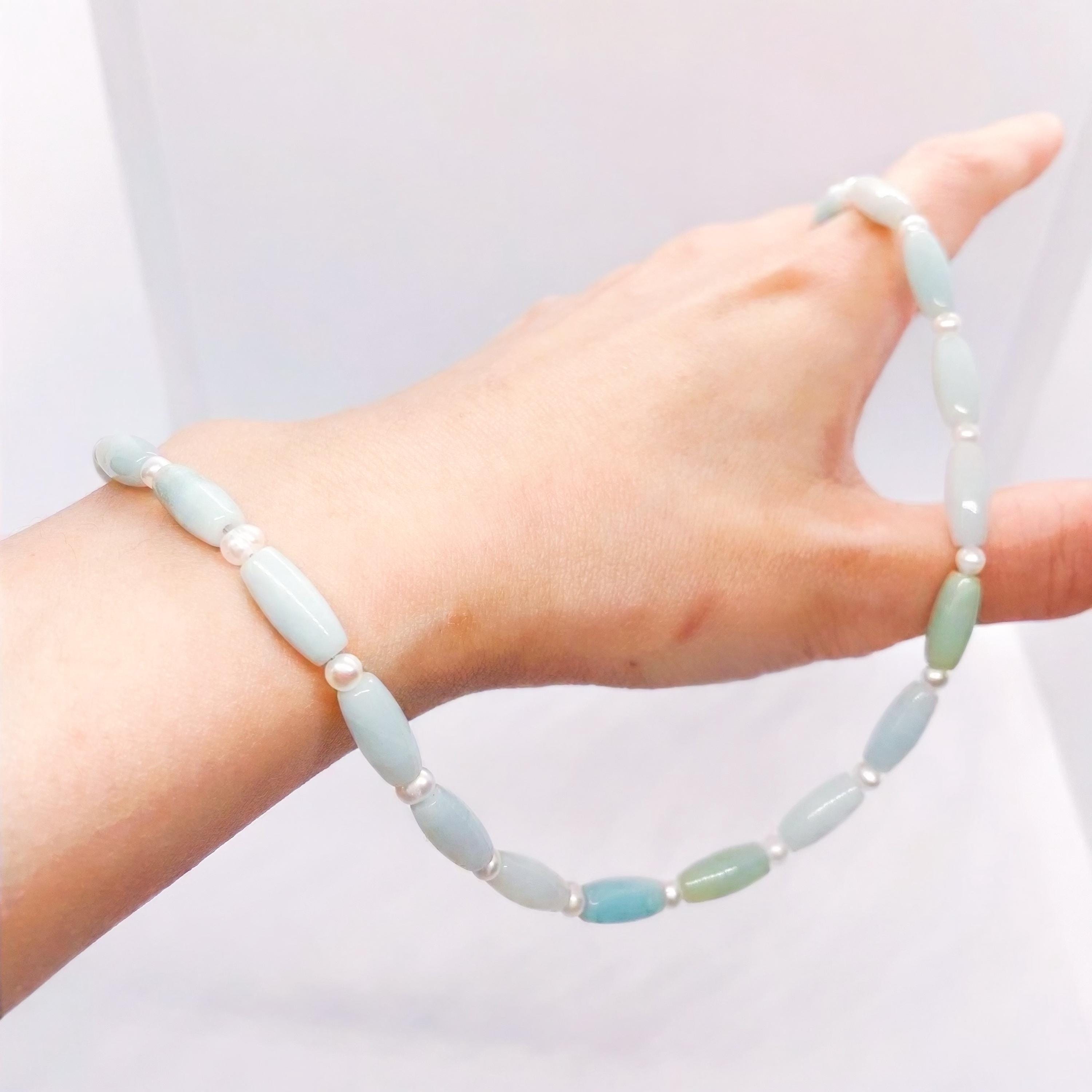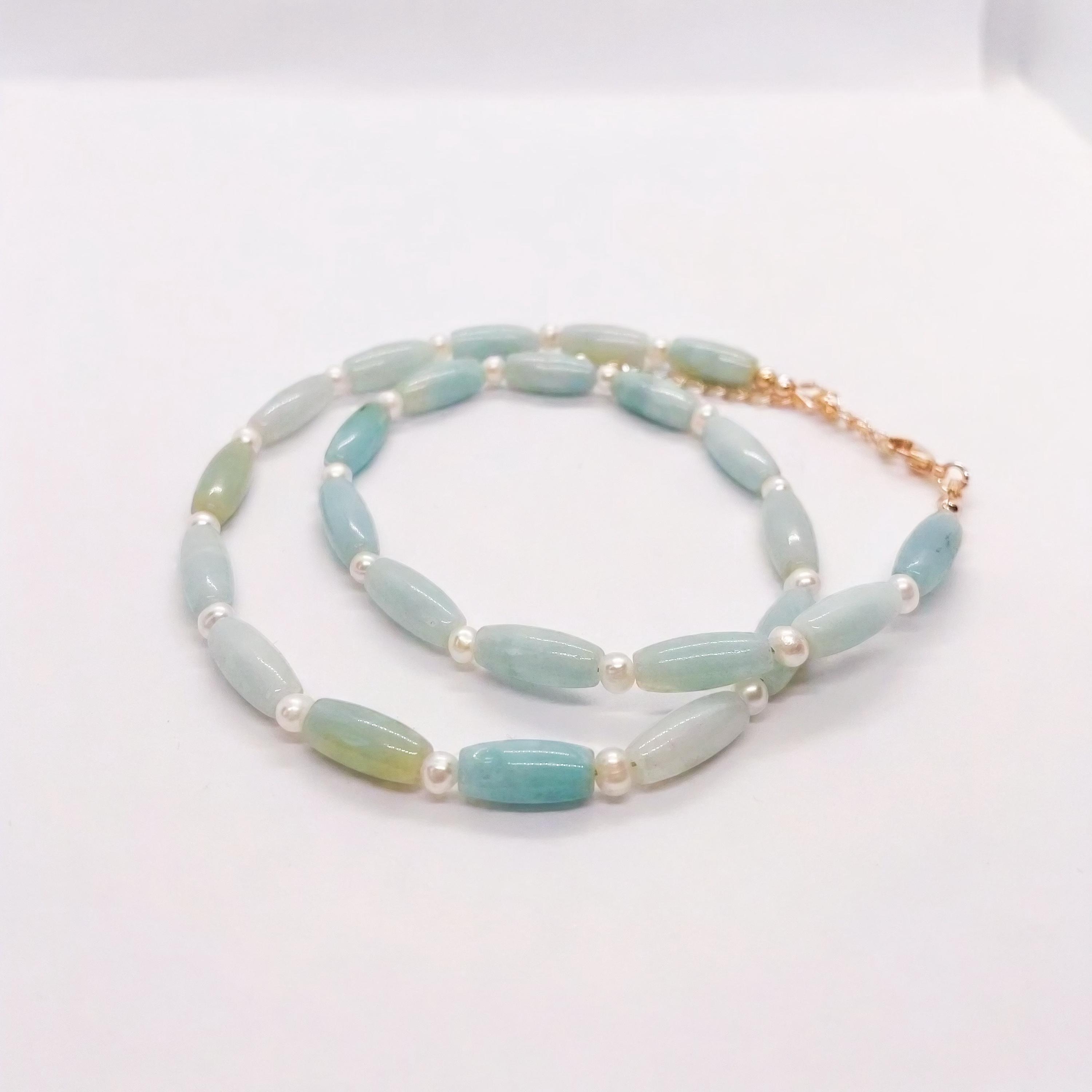 Amazonite(12*5mm), freshwater pearl (3-4mm), brass, & steel beading wire.