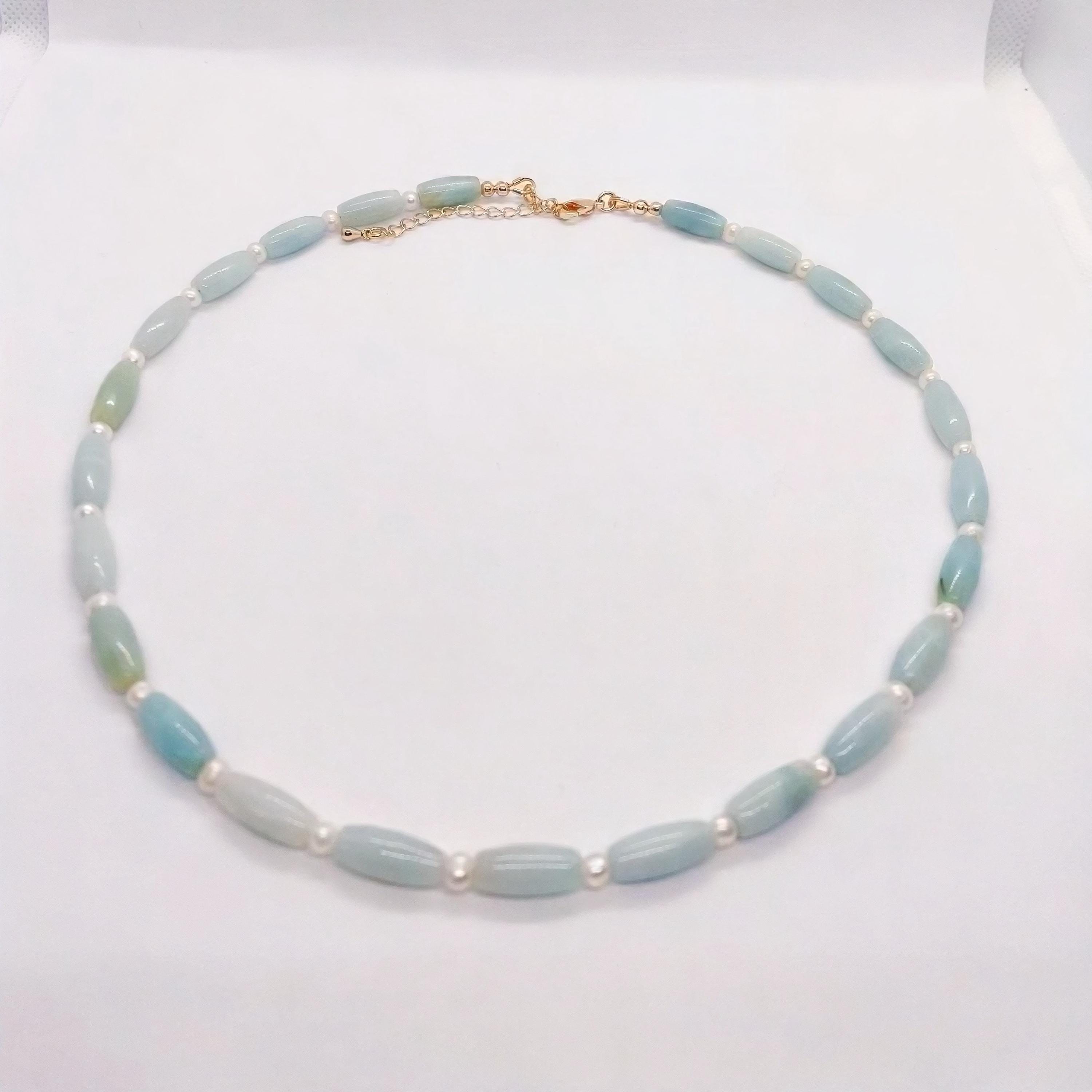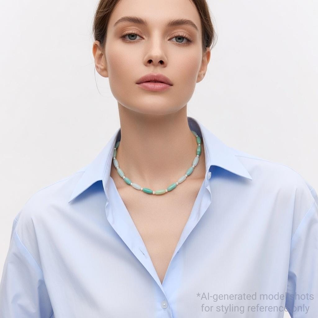 This Amazonite & Freshwater Pearl necklace blends soft green tones with timeless elegance.