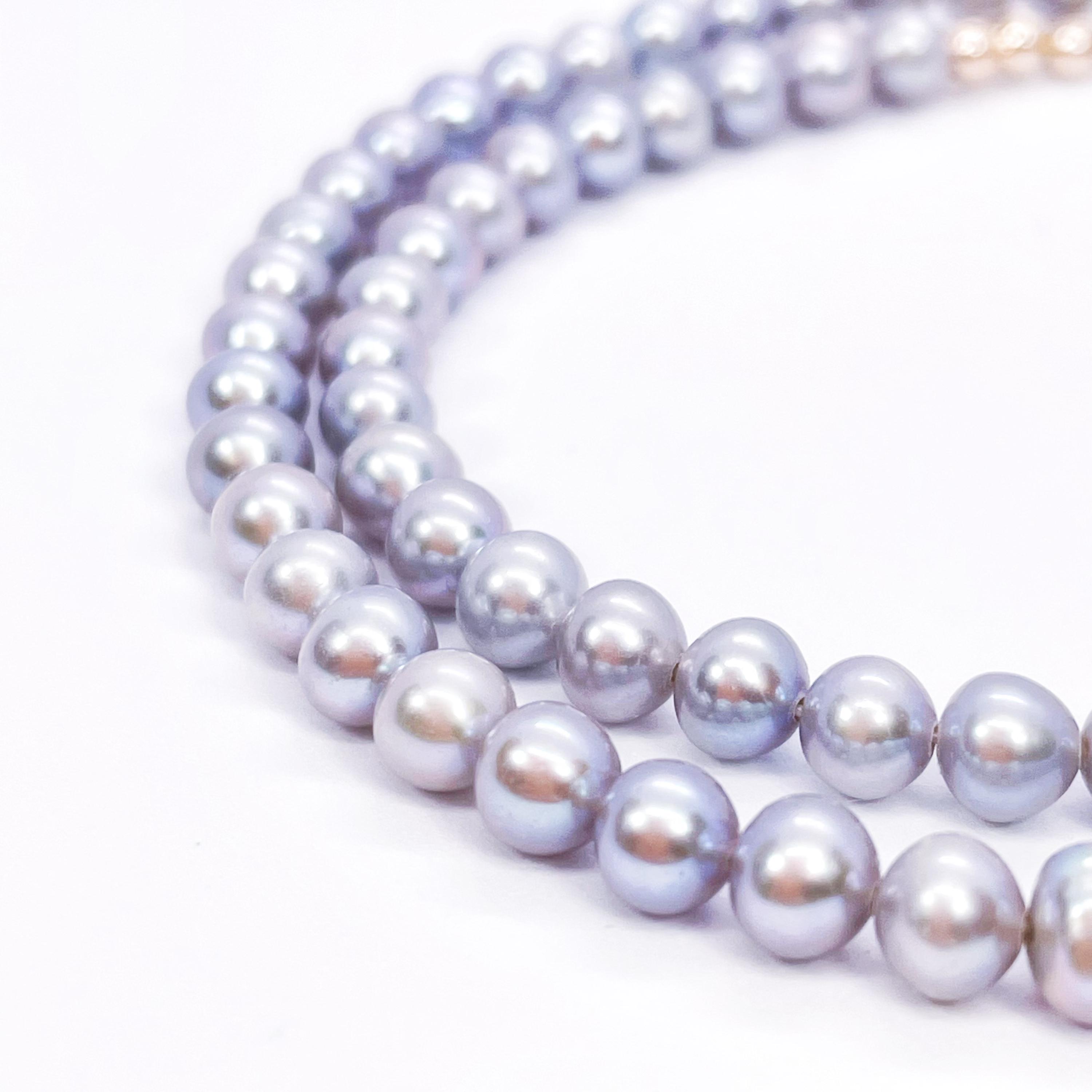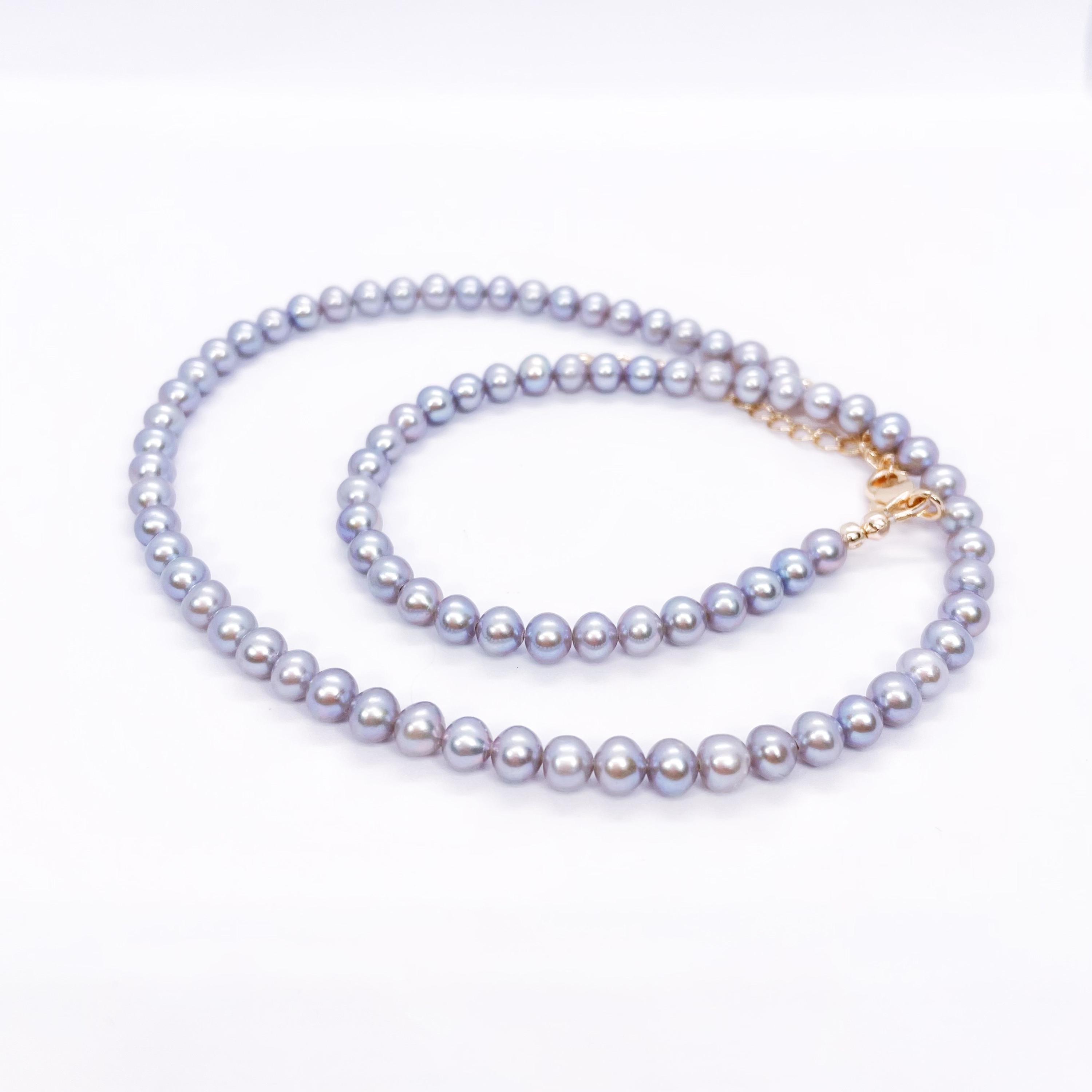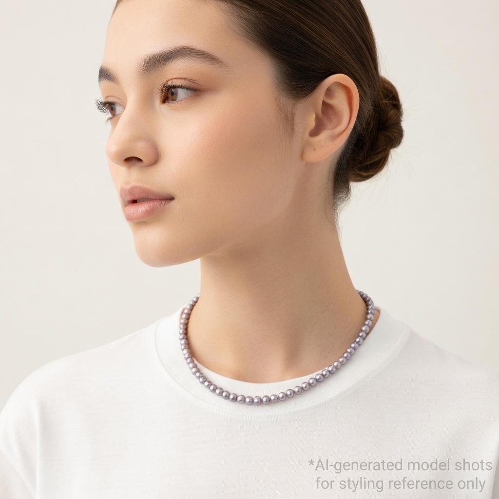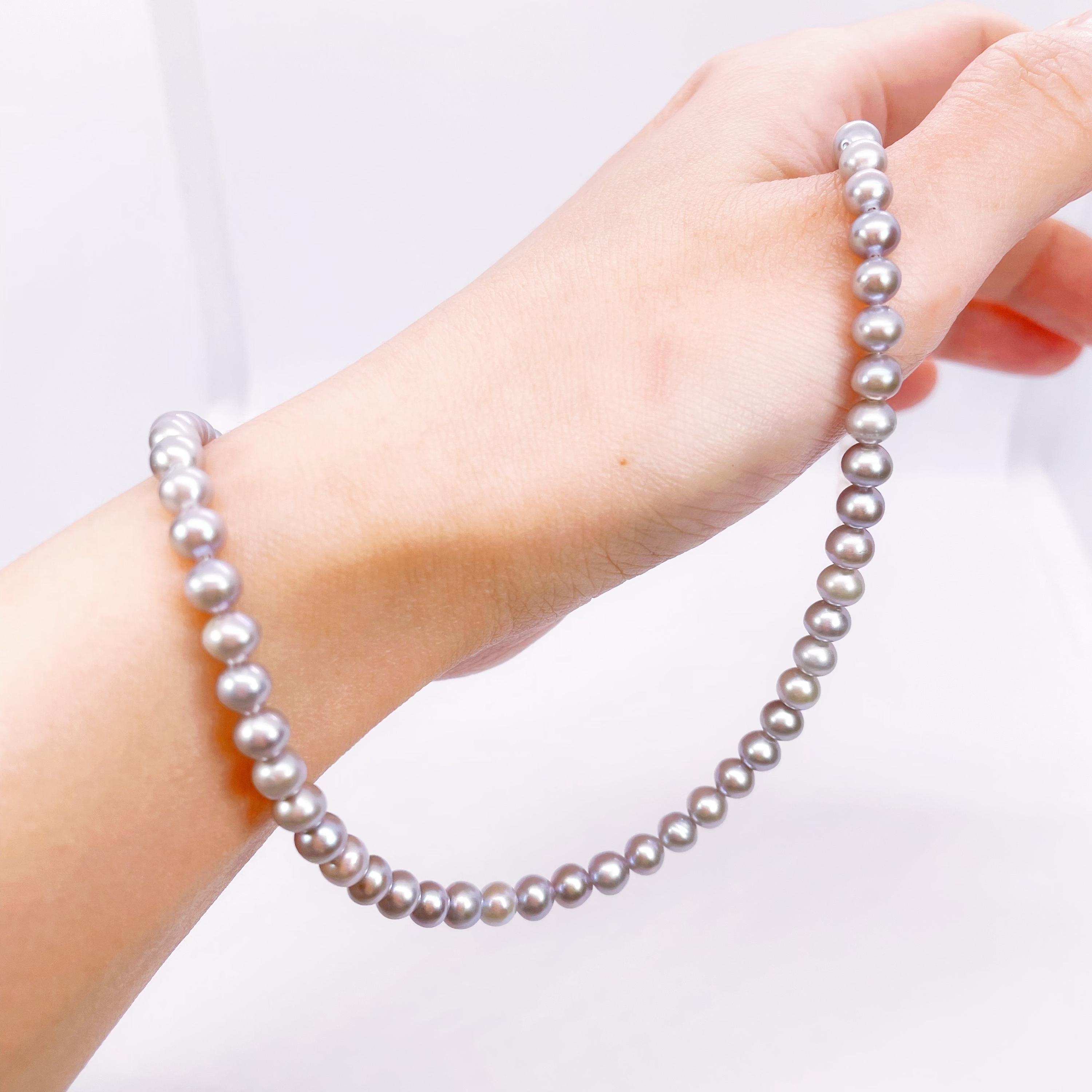 This Freshwater Pearl Necklace features a graceful strand of bright gray pearls, offering a modern take on a timeless classic. It is easy to pair with both casual outfits and more refined looks.