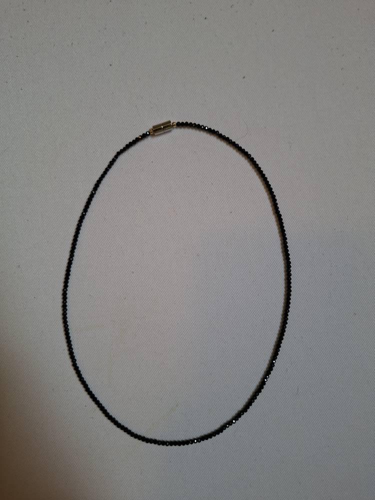 This simple choker necklace is made of faceted black spinel beads, finishes with a magnetic clasp and two 14K gold filled beads.
