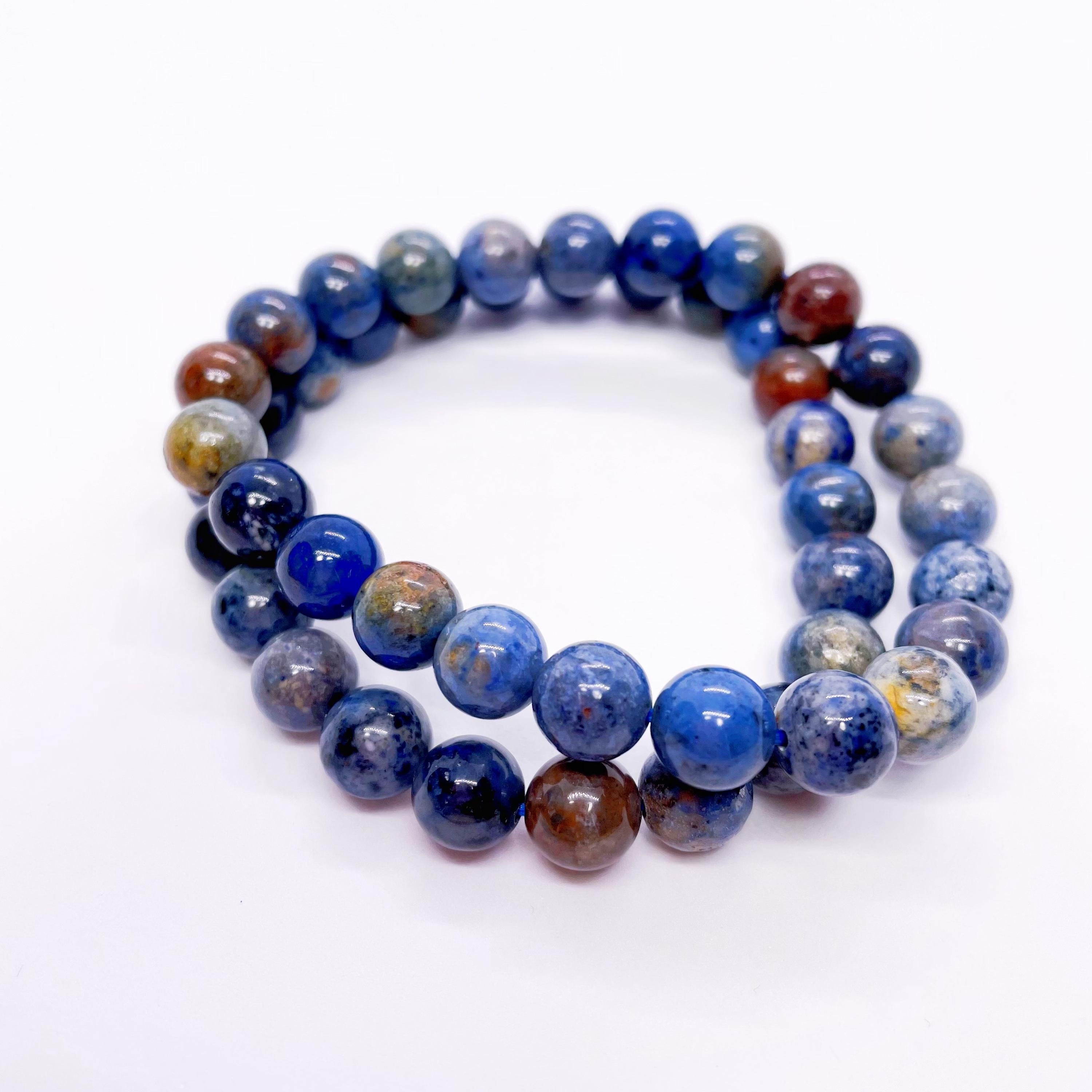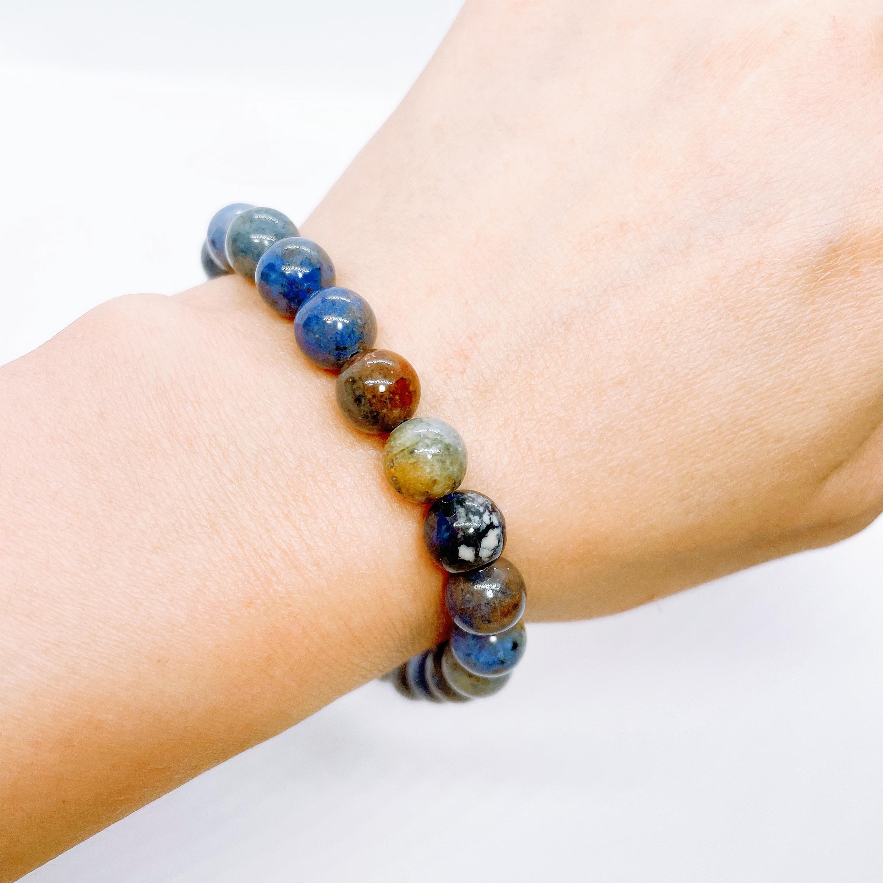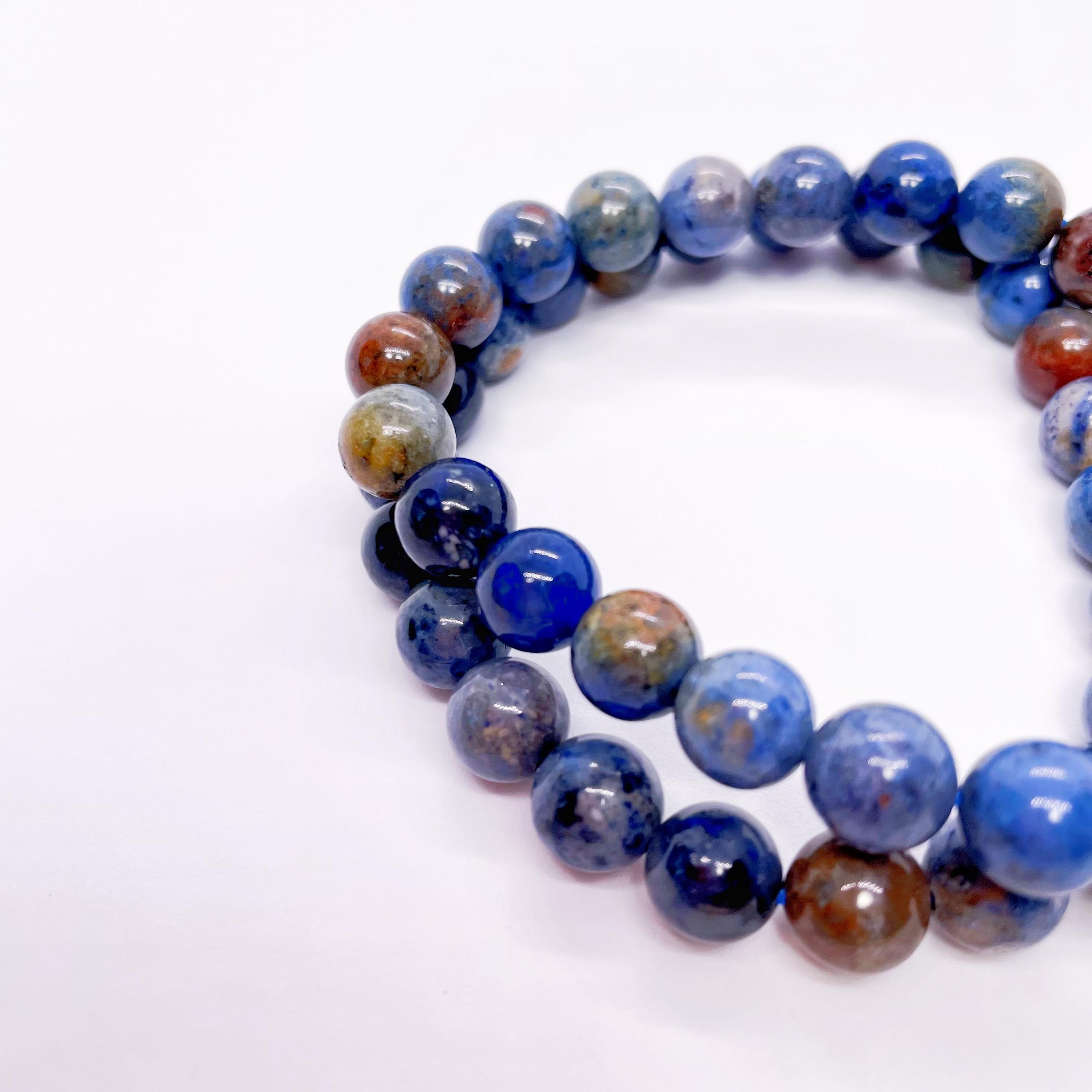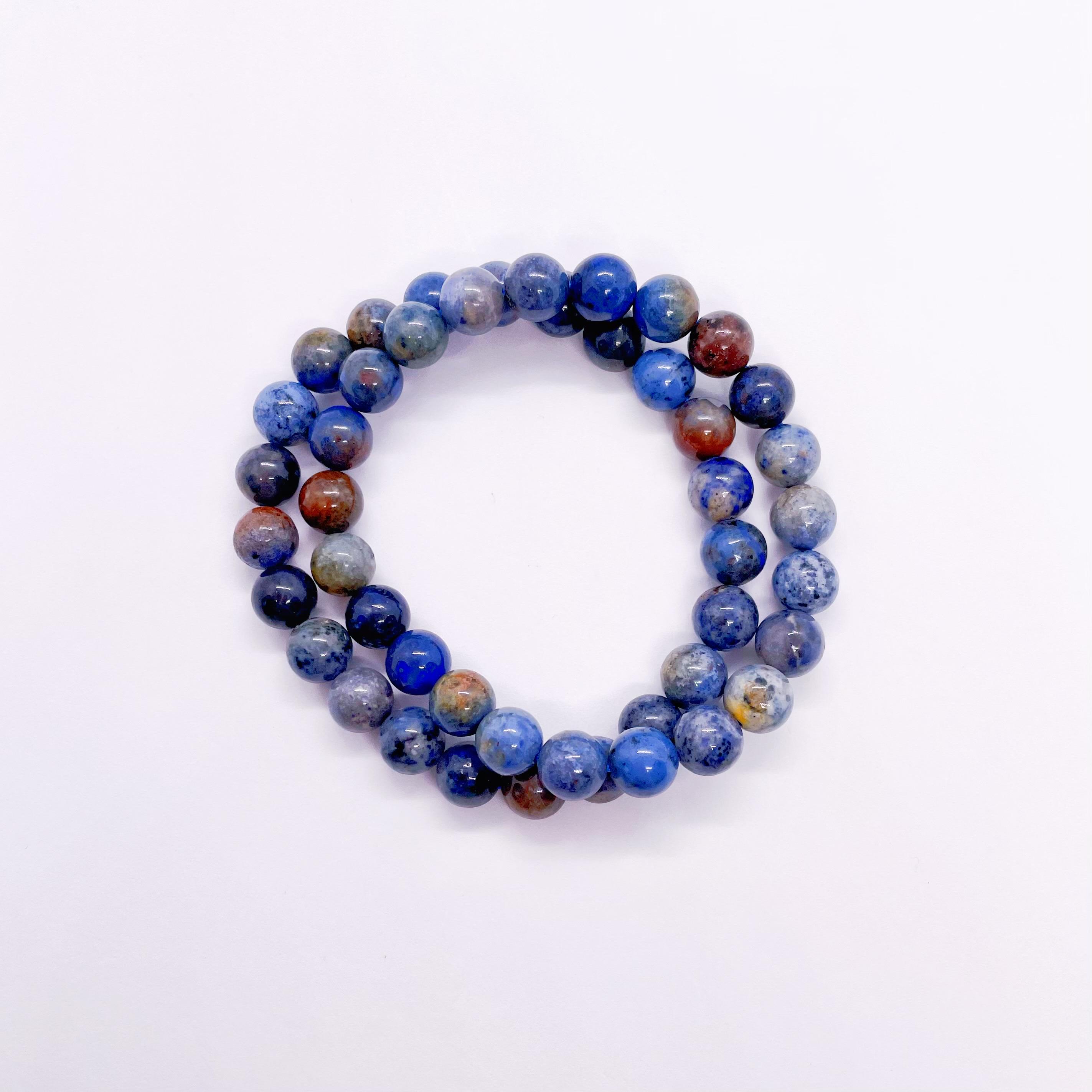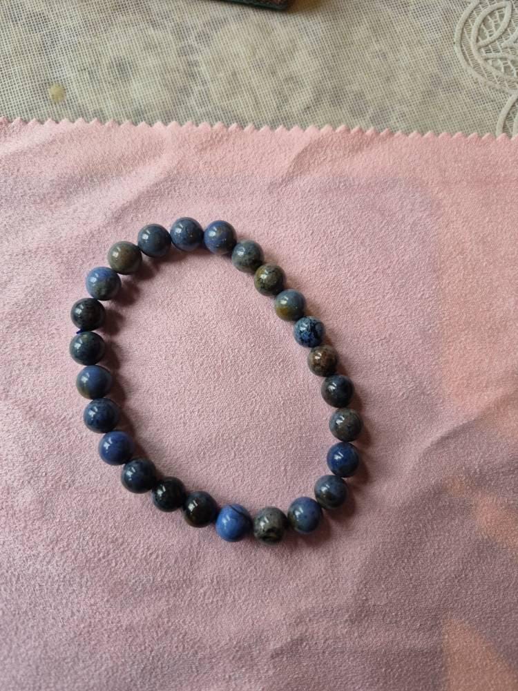 If you like blue color, you will love this sodalite bracelet. Various shades of blue, with few orange dashes. Contrast colors exist in harmony. In feng shui, sodalite possesses water energy and is thought to benefit occupational domains. And the color is totally suitable for professional looks.