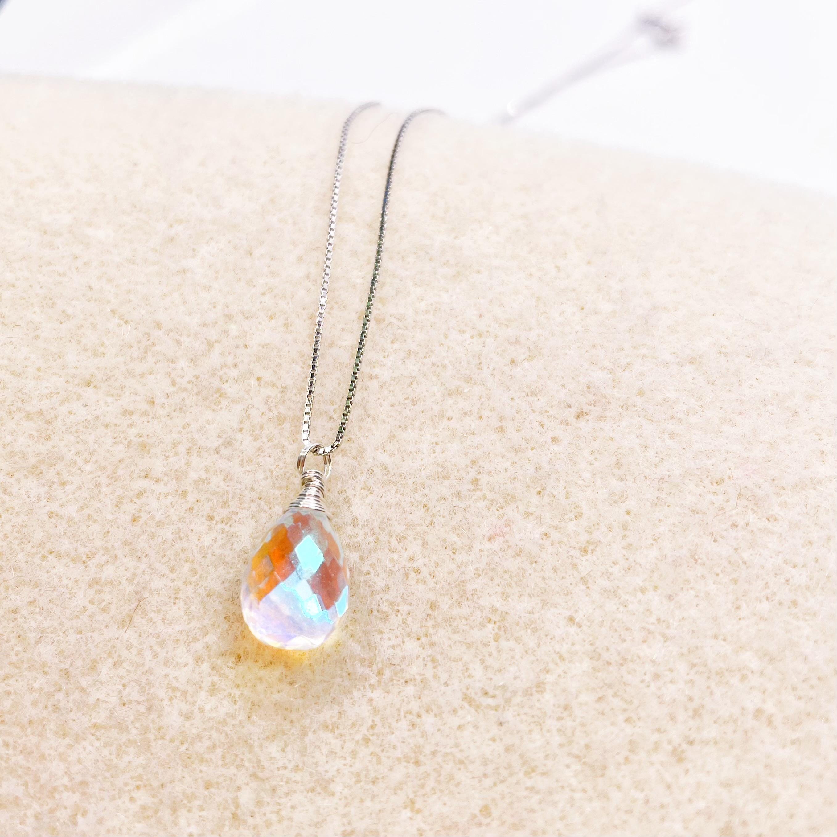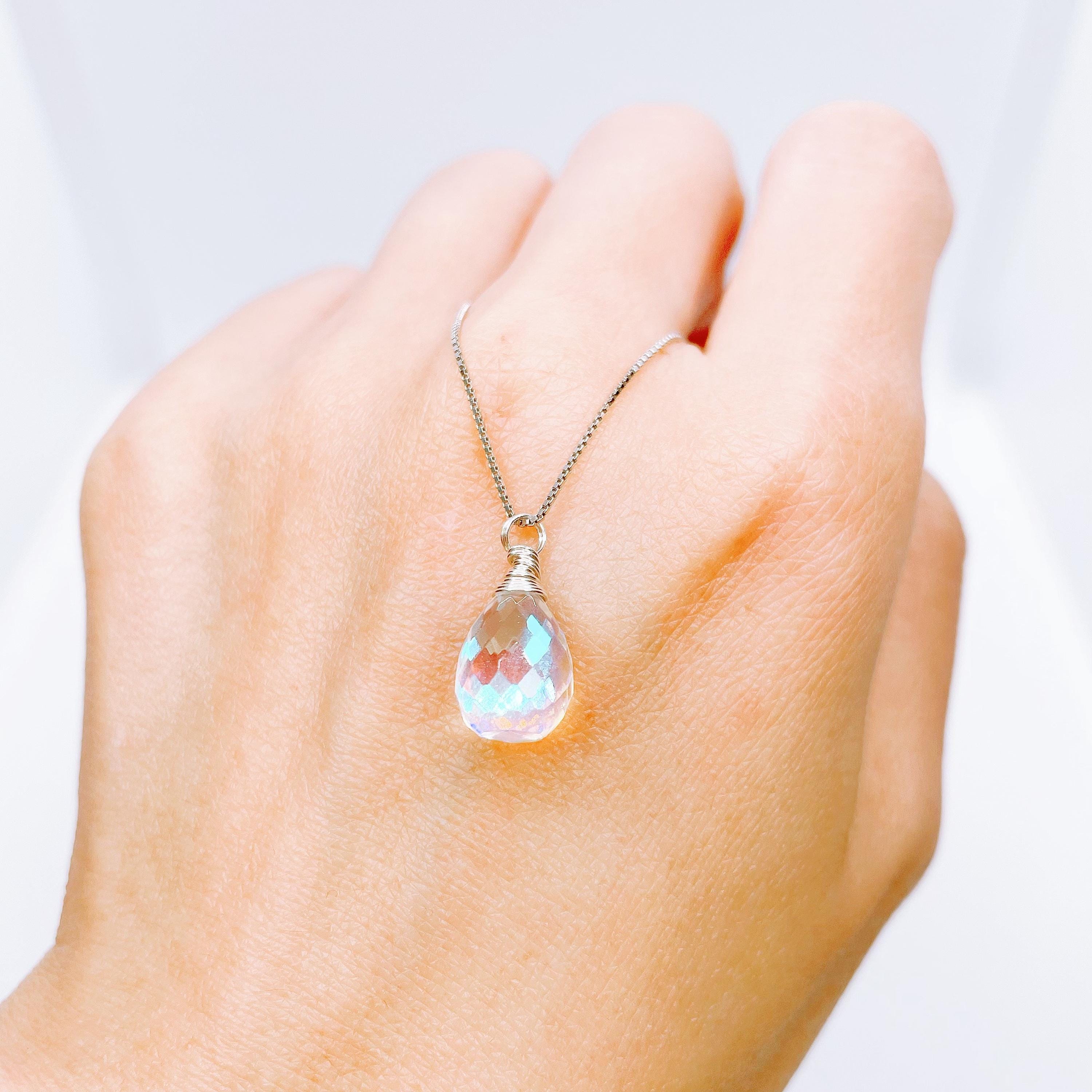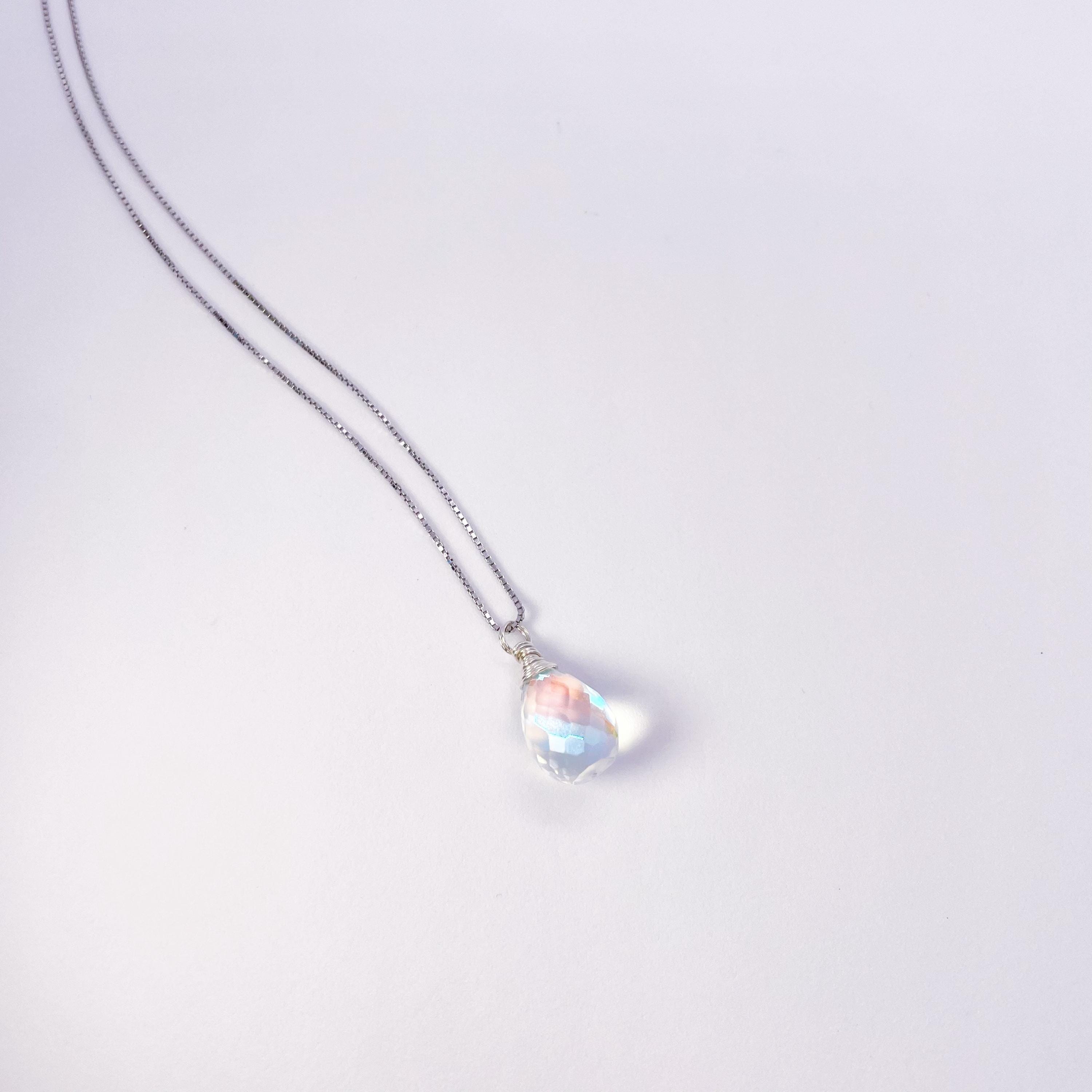 Elevate your style with our rainbow quartz pendant necklace. It's like morning sunshine strapped inside the clear pendant. Whether dressing up for a special occasion or adding a touch of twinkle to your everyday look, our rainbow quartz pendant necklace is sure to impress.